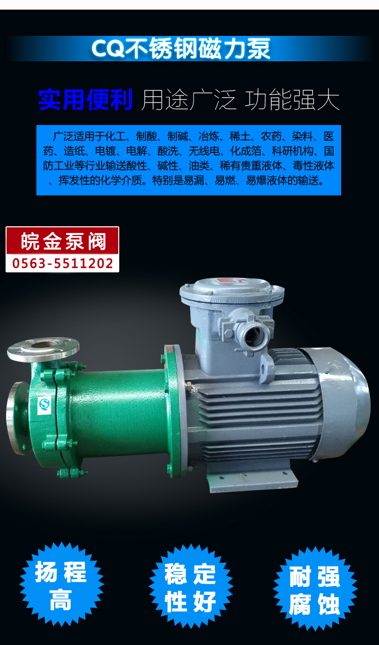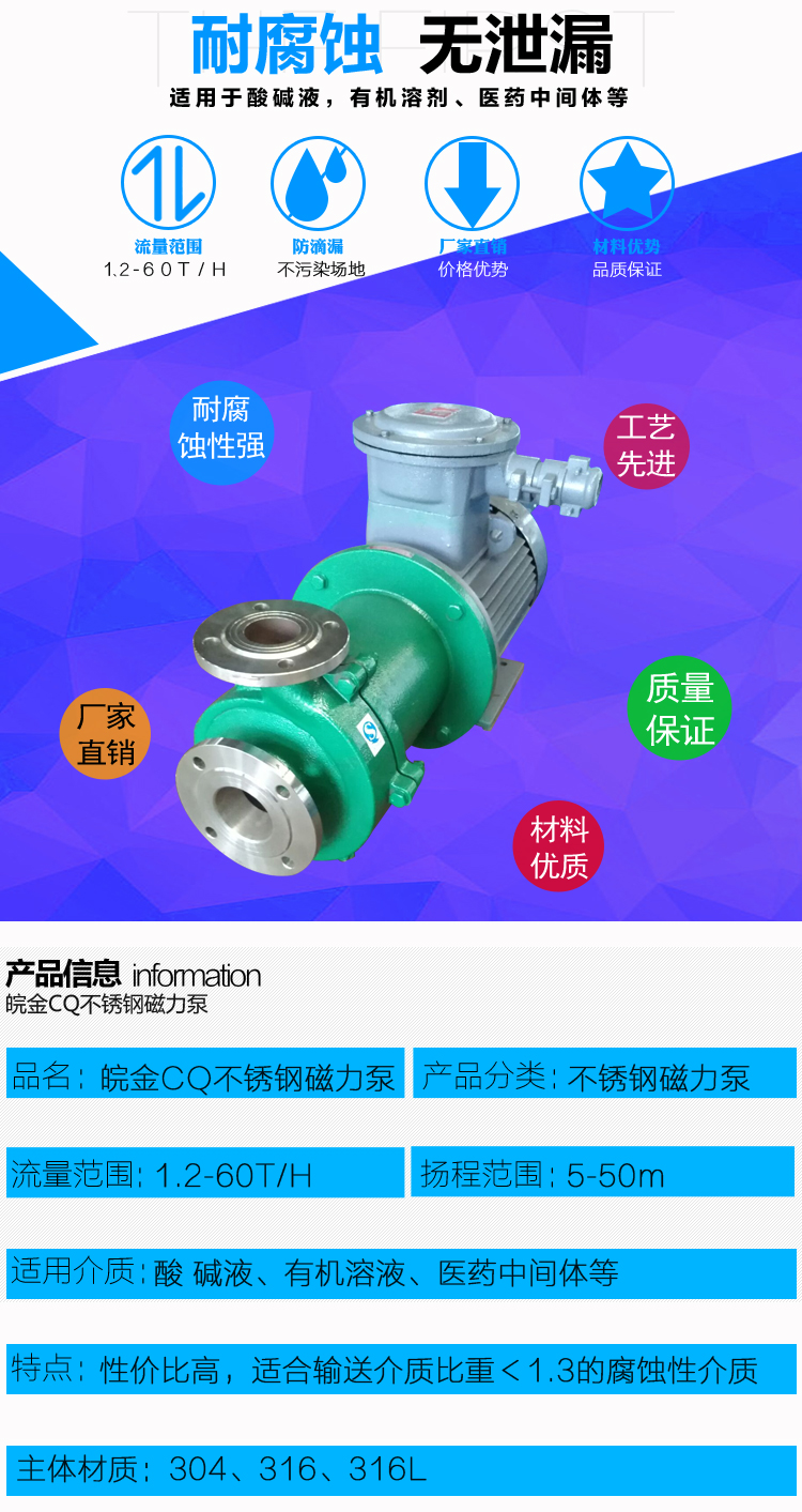 JCQ不銹鋼磁力泵是很早應(yīng)用的無泄漏不銹鋼泵,過流部件采用不銹鋼制成,是公司原CQ型升級產(chǎn)品,應(yīng)用于石油、化工、制藥、電鍍、環(huán)保、污水處理、酸洗等行業(yè)在金屬泵市場上該產(chǎn)品具有價(jià)格優(yōu)勢。產(chǎn)品結(jié)構(gòu)簡單,體積小,噪音低。