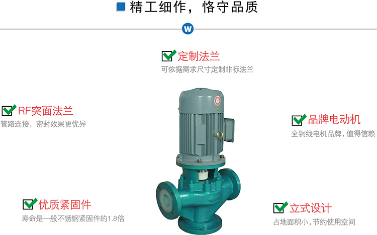 氟塑料管道泵又稱其為塑料管道泵、襯氟管道泵、四氟管道泵、耐腐蝕管道泵、襯塑管道泵、立式離心泵、立式管道泵,氟塑料管道泵是單吸單級離心泵的一種,因其進出口在同一直線上,且進出口口徑相同,仿似一段管道,可安裝在管道的任何位置故取名為管道泵(又名增壓泵)。氟塑料離心泵另有:IHF-D短支架型、IHF-L長支架型FSB-D短支架型、FSB-L氟塑料離心泵。